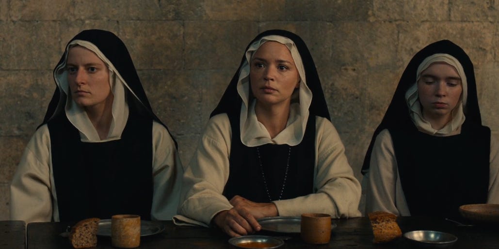 If all this 'sacrilege' stimulates your senses, let me warn you: Don’t be fooled by click-bait headlines and review pull-quotes. You can expect moderate nudity (wiggling boobies and booty, and pubic hair that looks suspiciously depilated for a 17th-century setting) and one same-sex scene that is basically oral sex. Both 'visions' and sex scenes are kept to a minimum. Most of the running time is dedicated to expose the social dynamic inside the 'convent' through the catalyst of Benedetta’s 'holy' claims and apparent 'miracles' (she sometimes speaks like a possessed woman and bleeds from stigmata). Whether these 'holy' acts are real or simply Benedetta’s fabrication is not the point. They’re a McGuffin. And their validity won’t be answered.